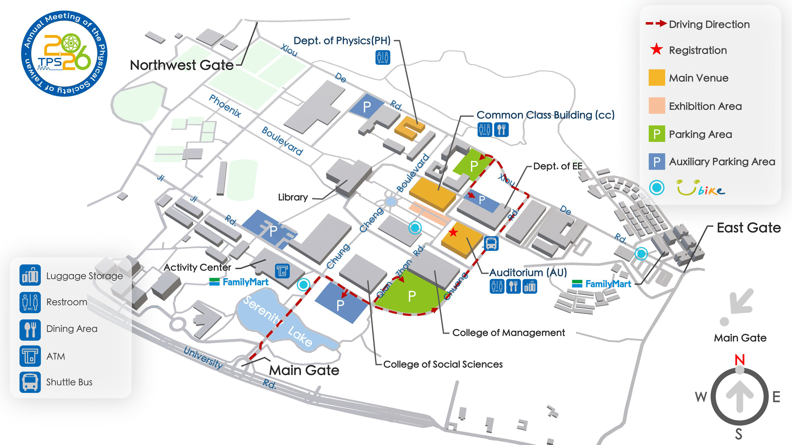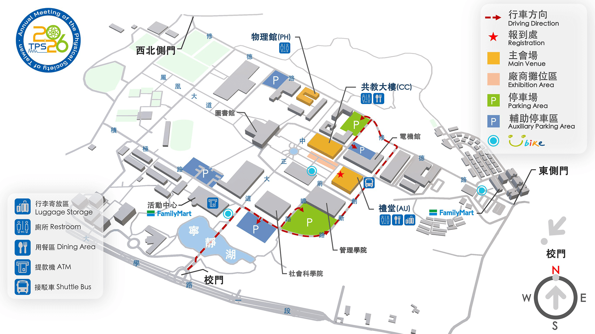 Registered participants are entitled to a special parking rate of NT$100 for three days. Parking passes may be reserved in advance through the registration form or purchased on-site at the registration form. Once payment is confirmed, vehicles may enter and exit the campus freely throughout the conference period without restriction on the number of entries.